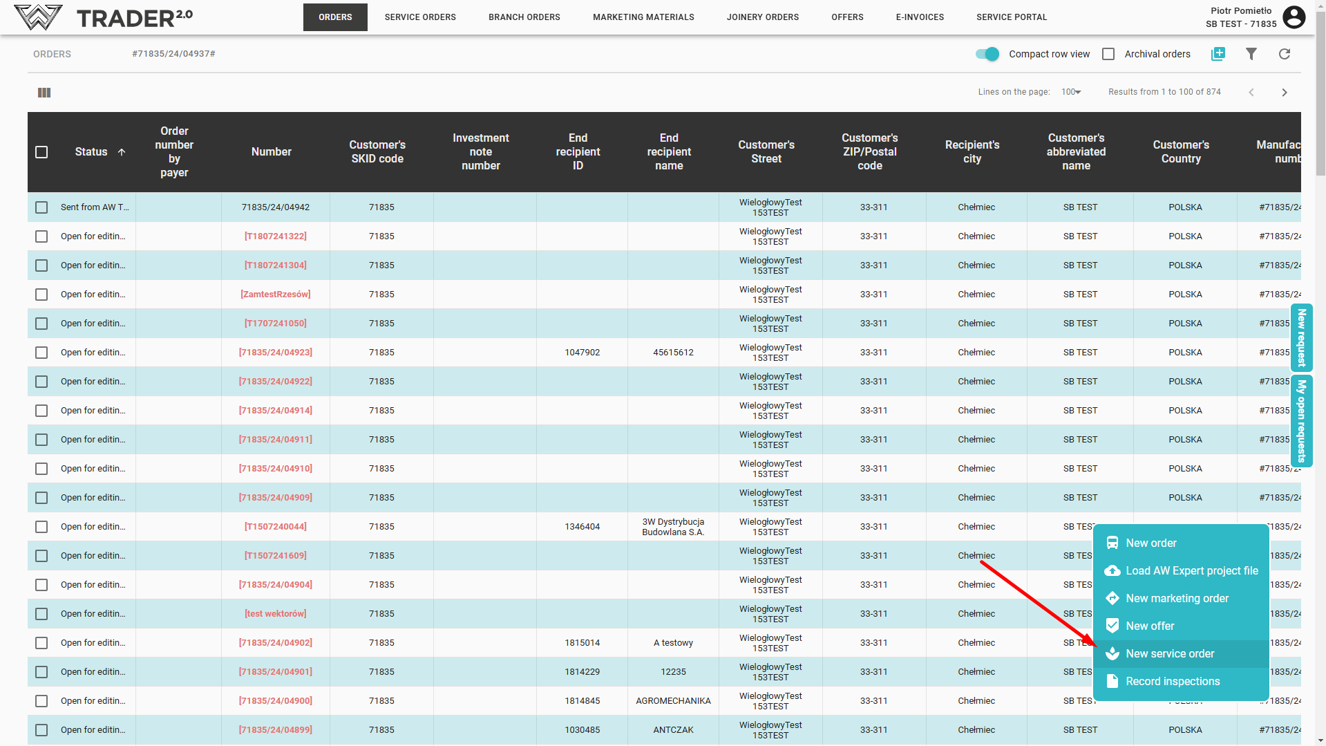 Next choose New service order