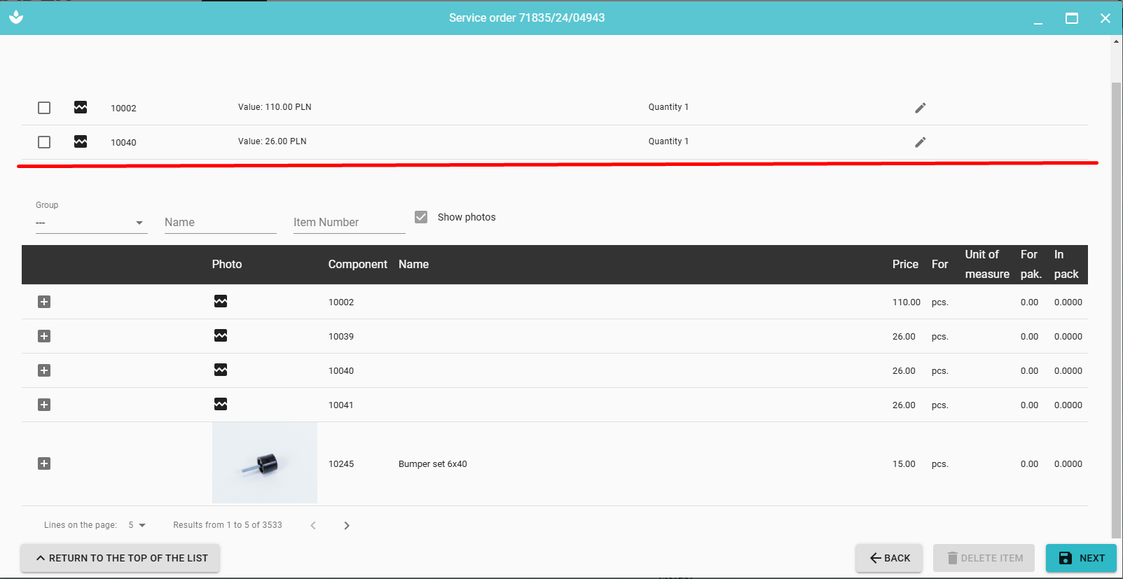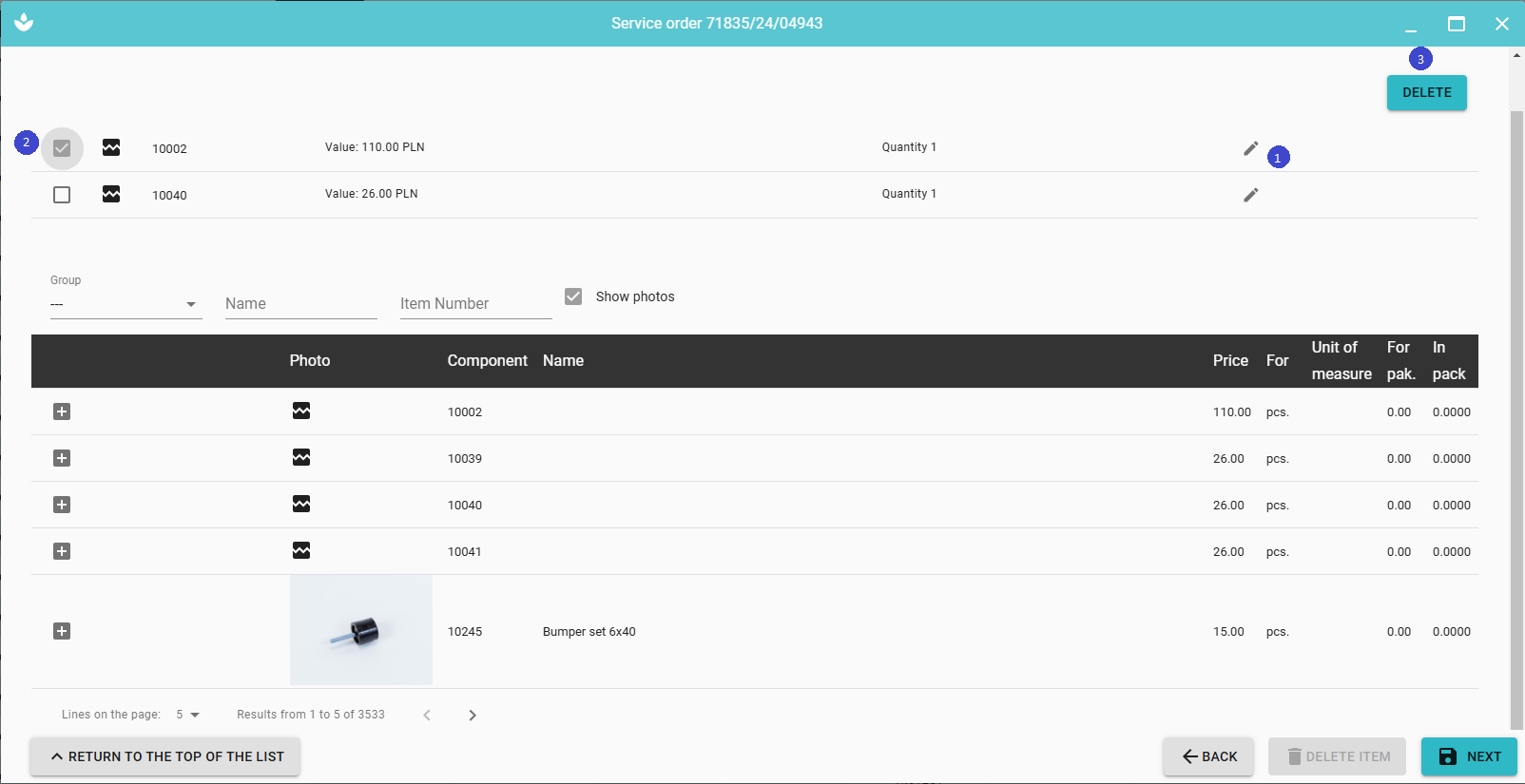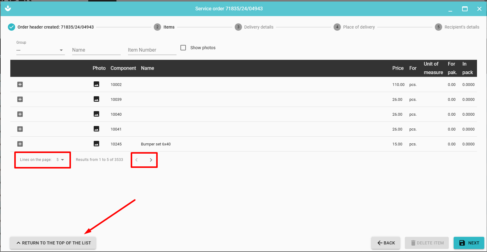 You can change the number of items displayed on the page. In case of a large number of records on the page, the button 'RETURN TO THE TOP OF THE LIST' allows you to quickly return to the top of the page, and use arrows to navigate between pages
