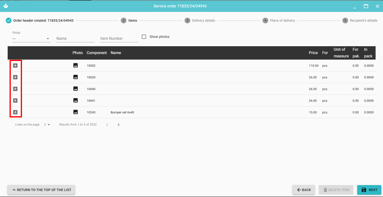 Items are added to an order by clicking on the “plus” located to its left of each record.