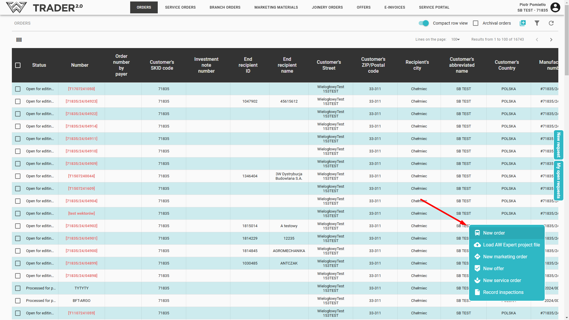 Additionally, it is also possible to enter a new order by pressing the a button available only on the tab ORDERS, located in the upper right corner above the list of orders.
