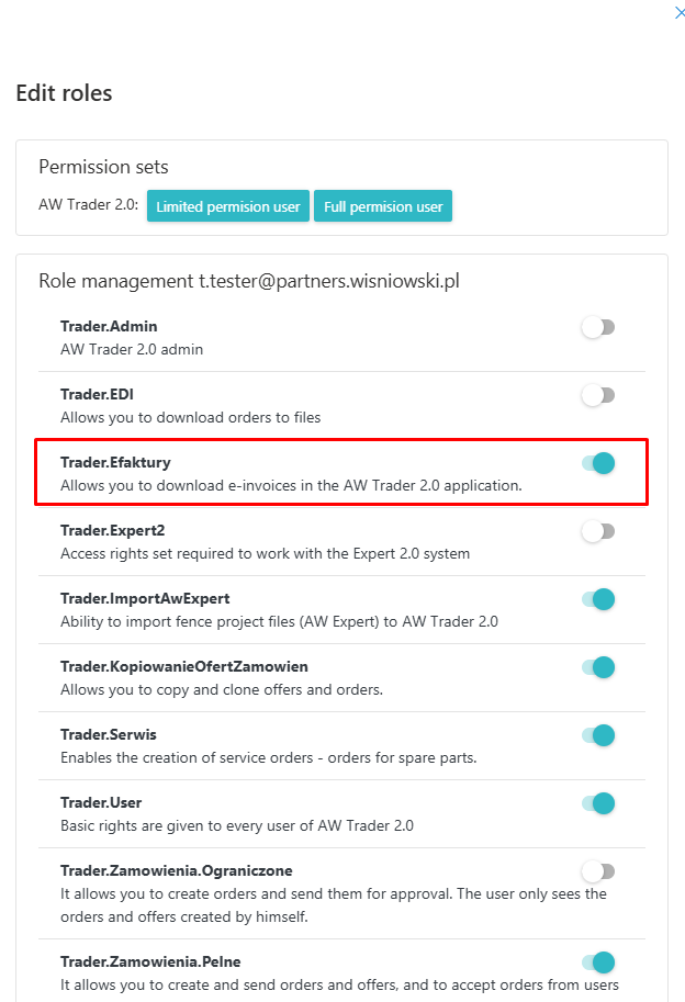 Access to this tab is restricted. If you have administrator rights to manage your company, you can assign the role Trader.E-invoices to selected people in the administration panel.