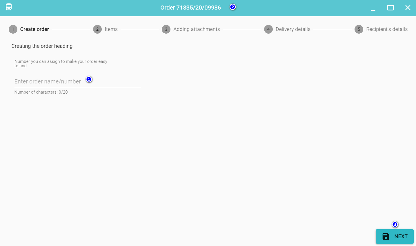 Order header - in this step you can enter your order number (1), which will also be visible on the top (2) - when you do this click Next (3).