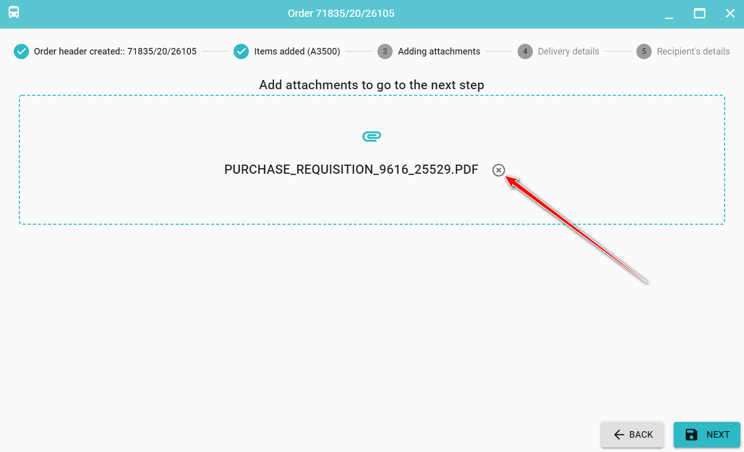 To remove an attachment click next to the attachement name.