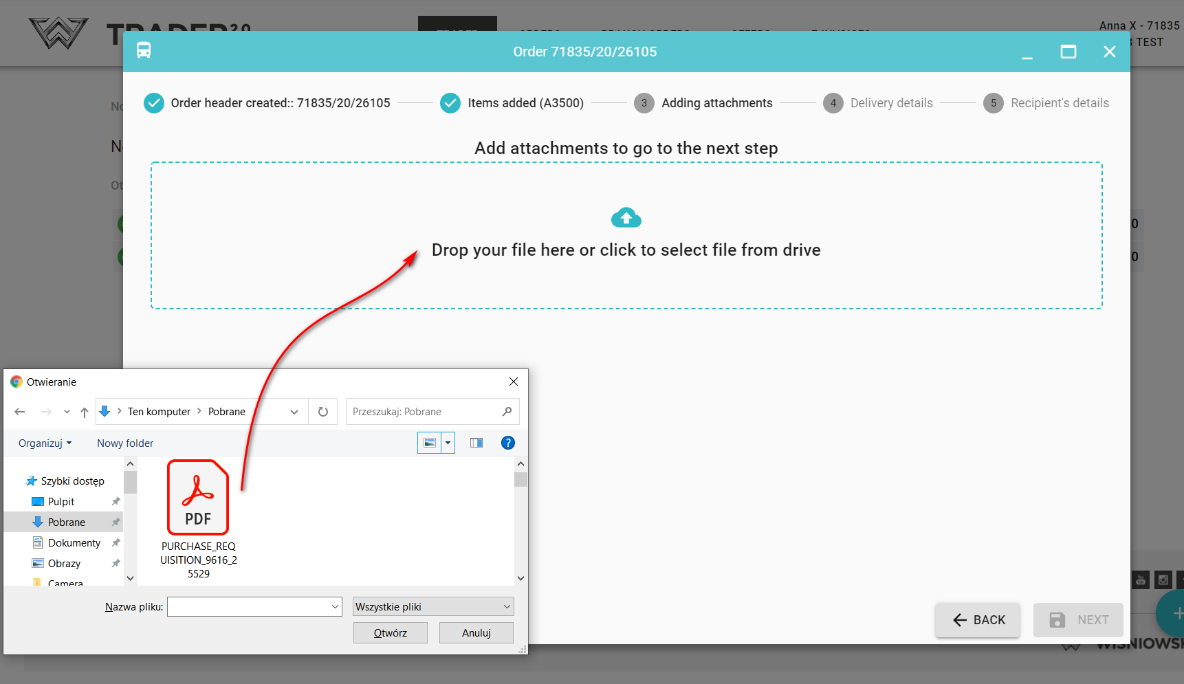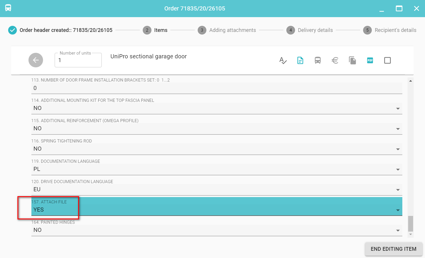 For each order, you can add an attachment. If the properties of a given product include ATTACH FILE sets the value YES adding an attachment is required and you cannot skip this step when entering an order.