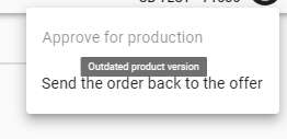 If the field is inactive when you try to approve the order for production, a notification will appear on this action informing you that there is an item on the order with an old version of the product and it is necessary to withdraw the order to the offer. Then follow the same steps as for updating the product version on the quotation.