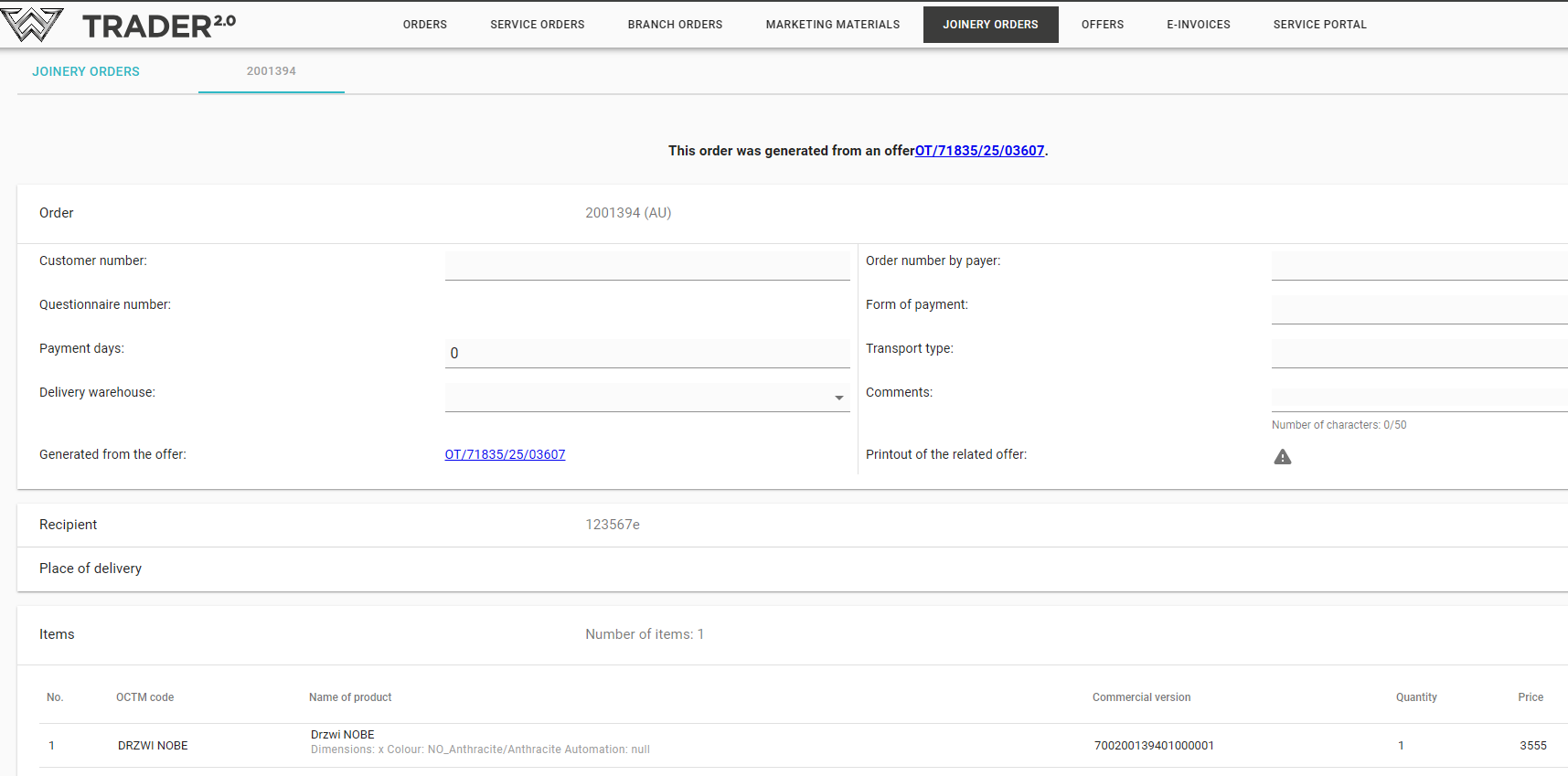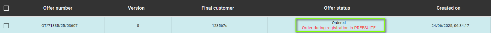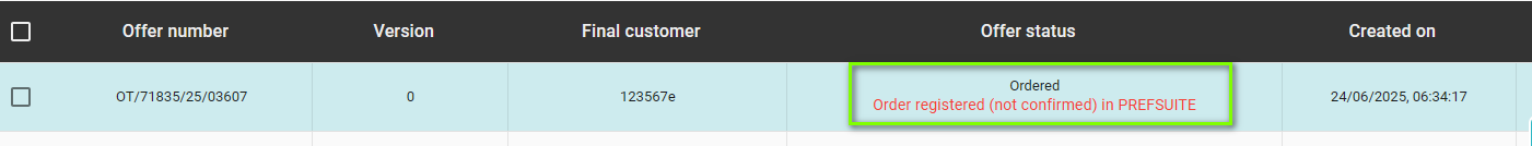After the order generation step, the status - Order pending registration in PrefSuite - will appear in the Offers tab next to the previously created document.