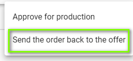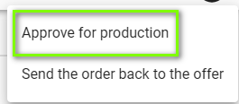 To approve an order for production, navigate to the order in question by clicking on the three dots icon in the top right corner as before. Then select the Approve for production option.