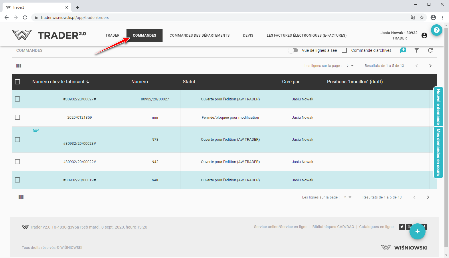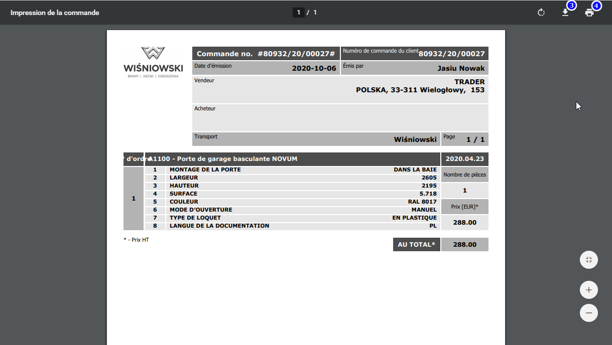 Après avoir cliqué sur l'icône, un fichier PDF de la commande sera généré. Le fichier généré peut être téléchargé (3) et enregistré sur votre ordinateur ou imprimé (4).