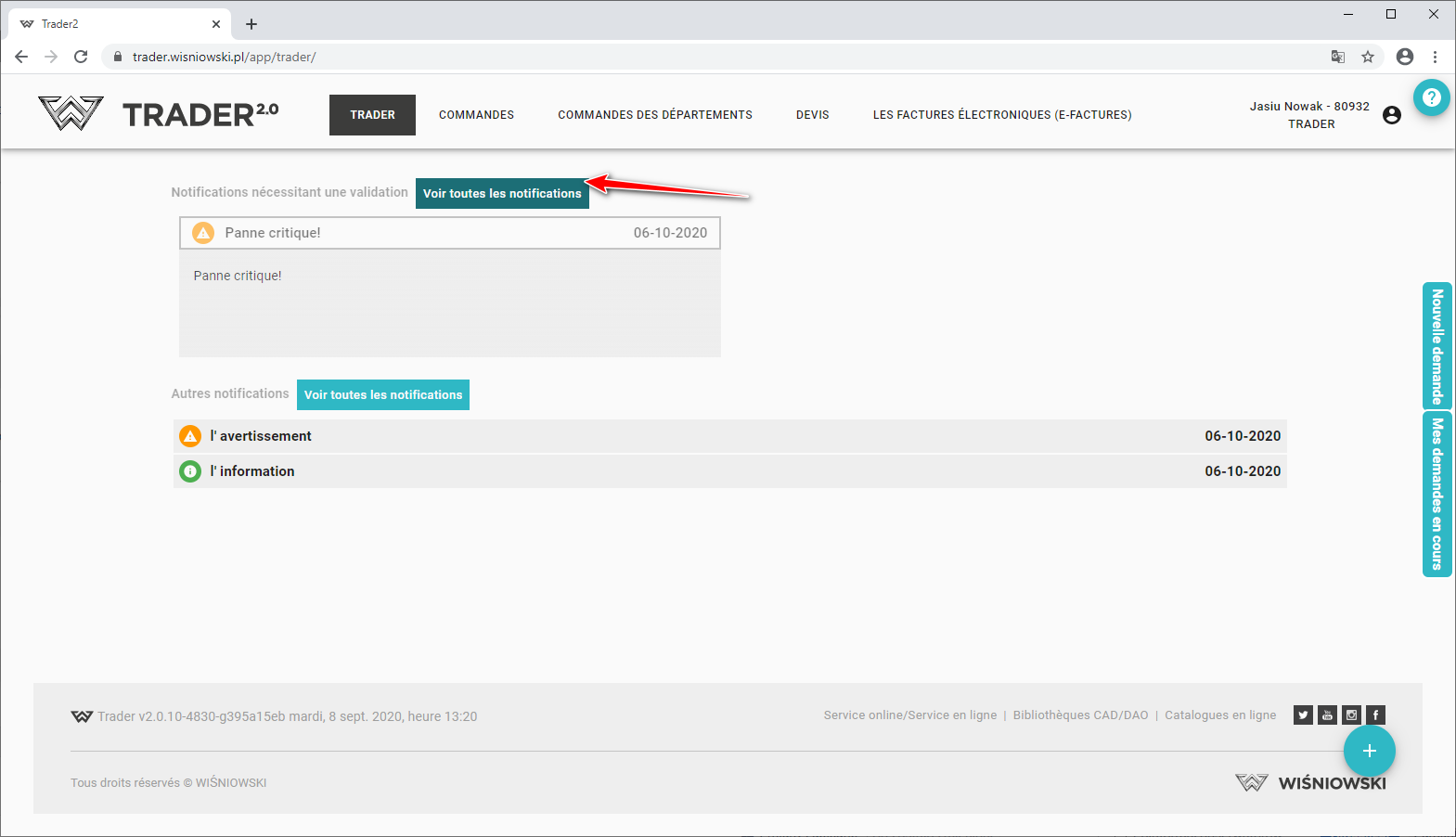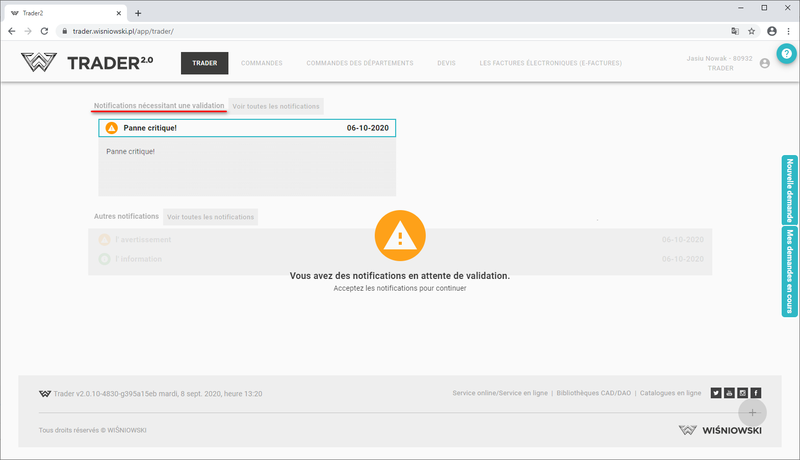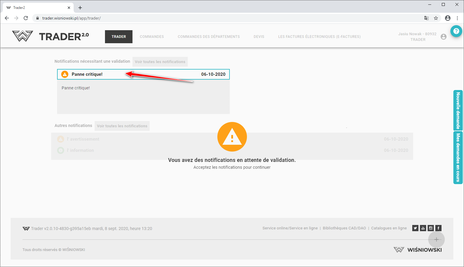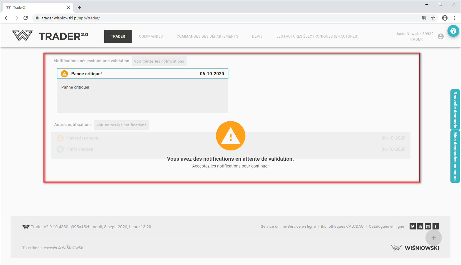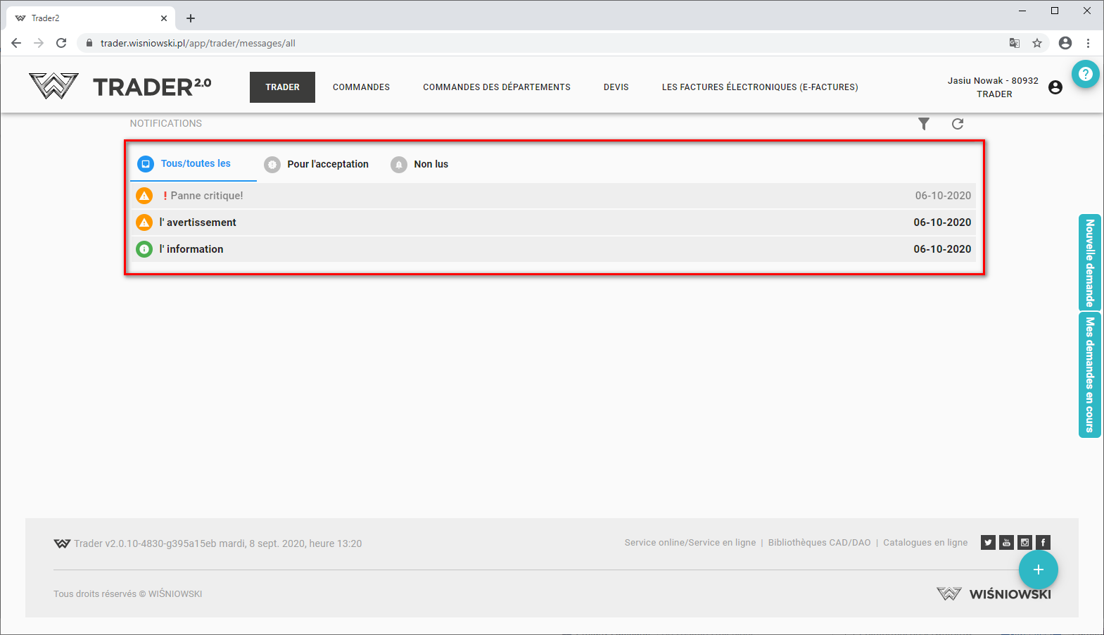 Une fois connecté à AW TRADER, la page d'accueil affiche les notifications affichées par la société Wiśniowski..