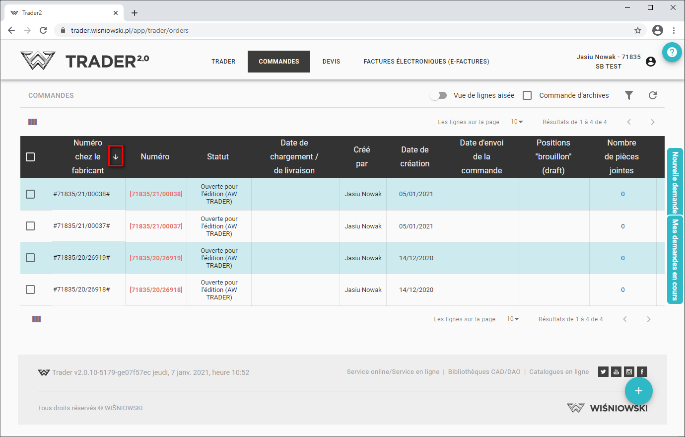 Pour filtrer plusieurs commandes avec des paramètres déterminés, cliquez sur l'icôn dans le coin supérieur droit de la liste de commandes (3).