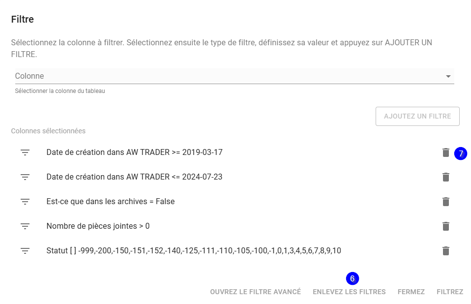 On enlève les filtres en cliquant sur Enlevez les filtres (6) soit en cliquant l'icône (7)