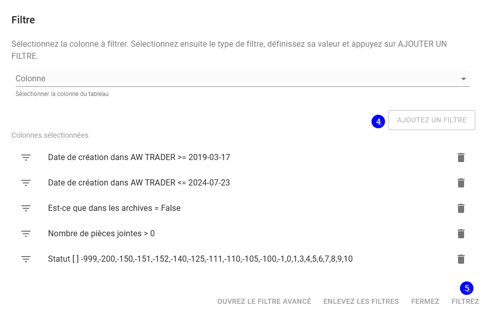 Le filtre est lancé en cliquant sur Ajoutez un Filtre (4) et ensuite Filtrez (5).
