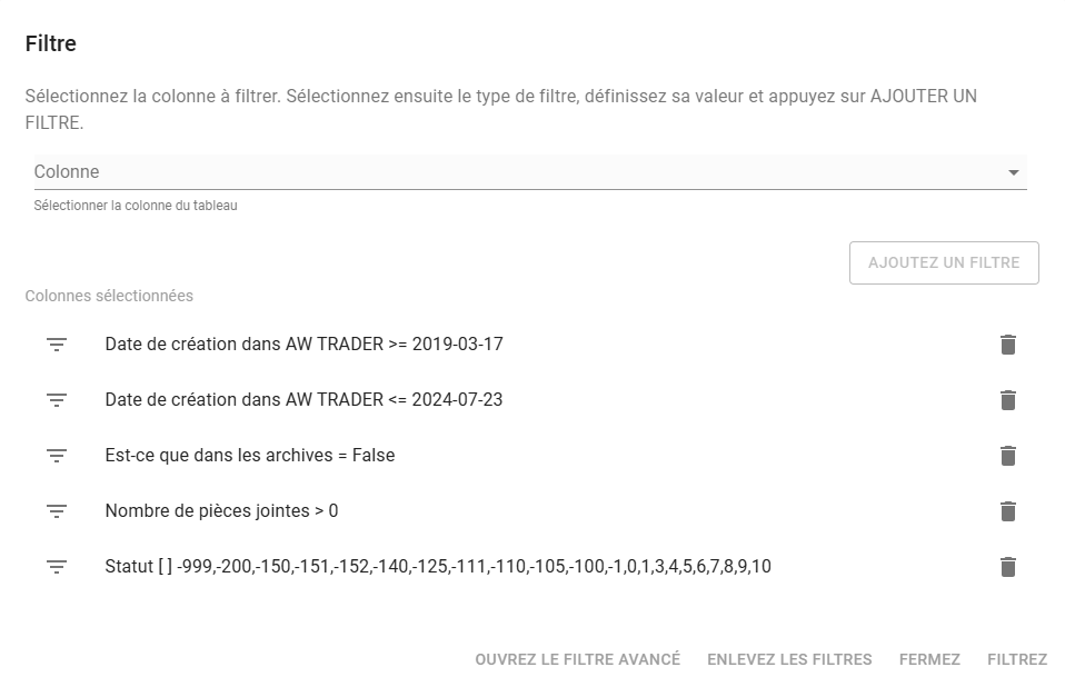 Le filtre avancé permet de filtrer selon la colonne sélectionnée.