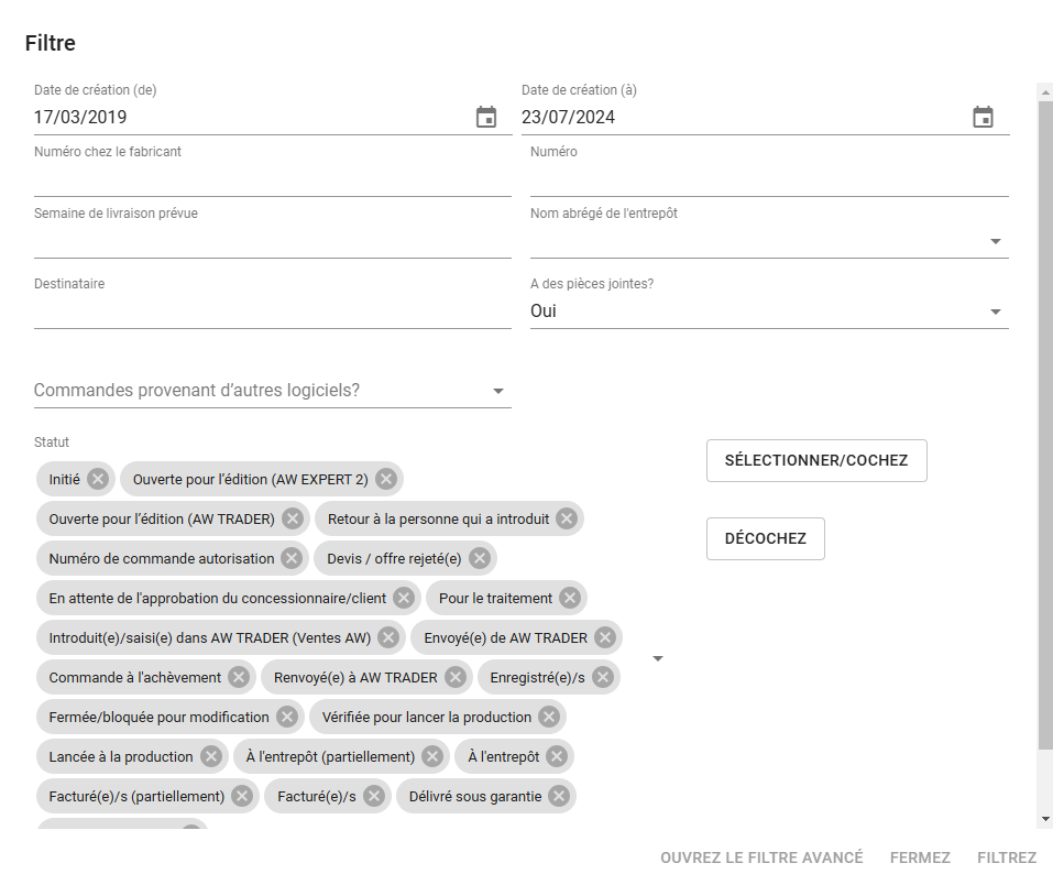 - statut de la commande (possibililté Cochez/Décocheztous les statuts soit le choix de la liste)