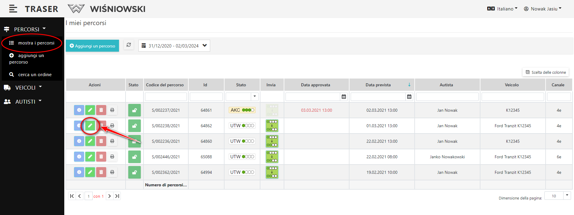 1. Seleziona dal Menu laterale: Percorso → mostra i percorsi. Dovrebbe apparire una lista di Percorsi.