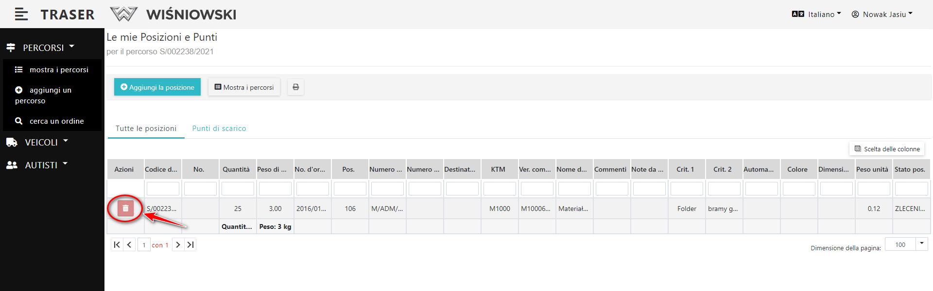 1. Vai ai dettagli del Percorso (Rys. 1.) e fare clic sul tasto rosso con l'icona del cestino, accanto alla Posizione selezionata (Dis. 4.). Poi conferma cliccando sul pulsante "ELIMINA".