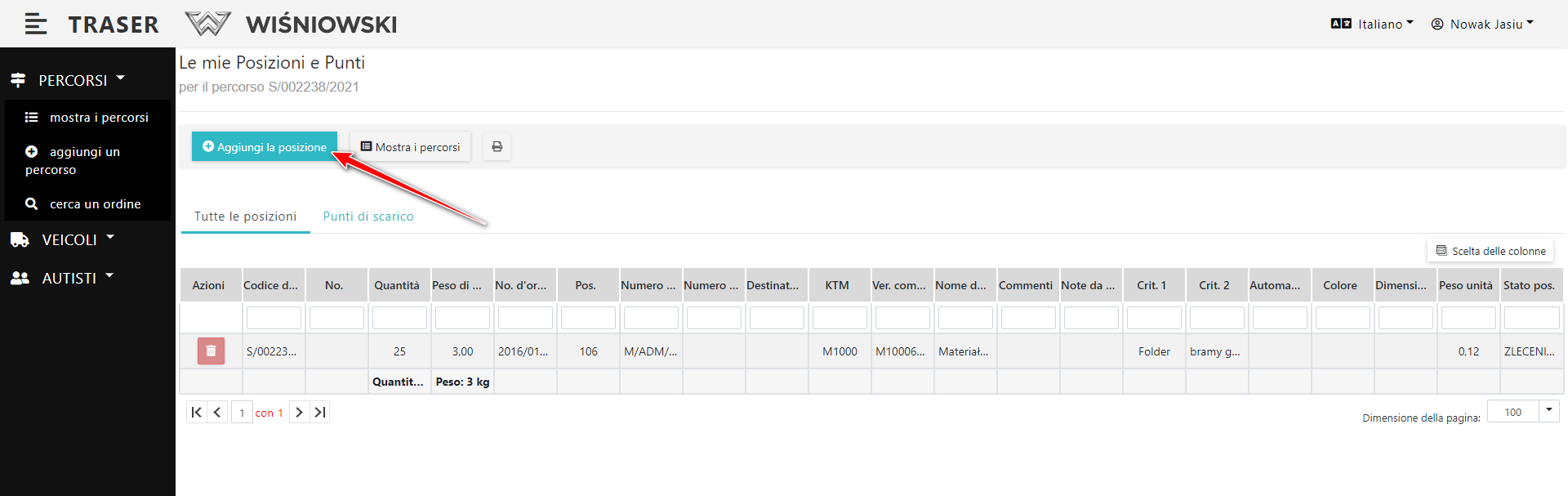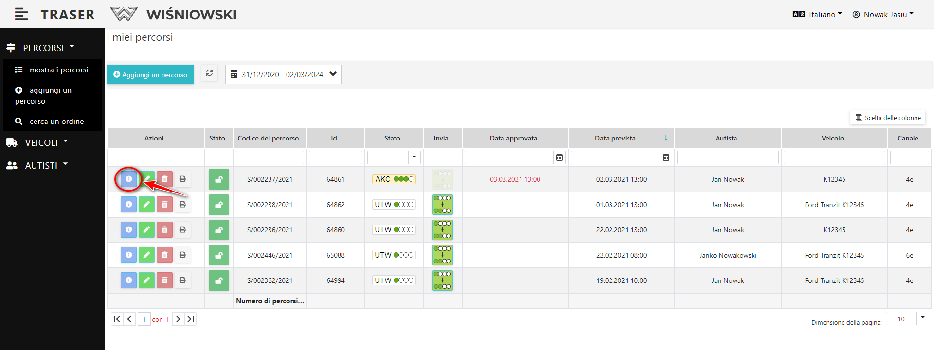1. Seleziona dal Menu laterale: Percorso → mostra i percorsi. Dovrebbe apparire l'elenco dei Percorsi. Fare clic sul tasto blu con l'icona delle informazioni, accanto al Percorso selezionato (Dis. 1.).