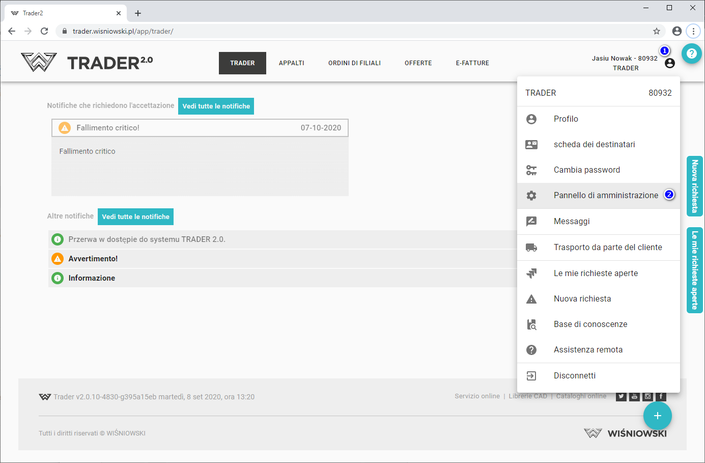 Per accedere al pannello di amministrazione, fare clic sul nome utente (1) e selezionare Pannello di amministrazione (2) oppure accedere al sito pa.wisniowski.pl.