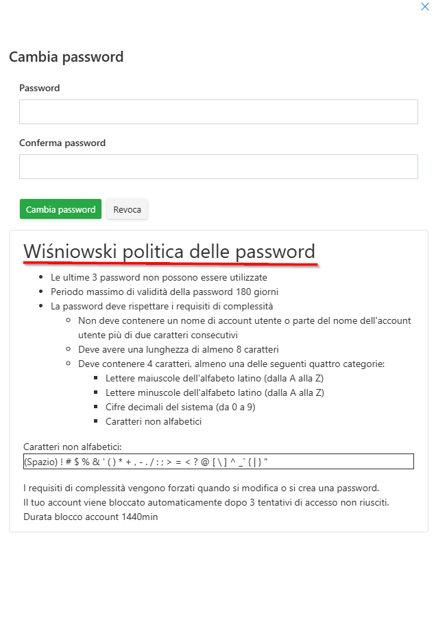 Per cambiare la password di un utente selezionato, è necessario fare clic sull'icona e inserire una nuova password in conformità con la politica di sicurezza descritta nella finestra di cambio password.
