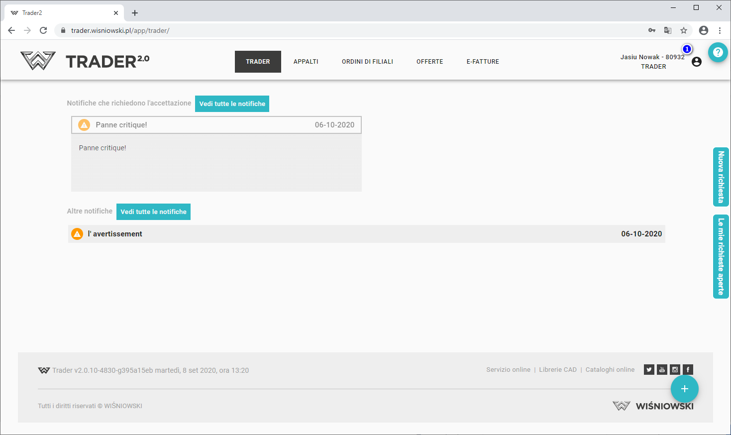 Possiamo anche vedere immediatamente a quale azienda siamo collegati e quale utente è collegato (1) così come le informazioni e i messaggi forniti.