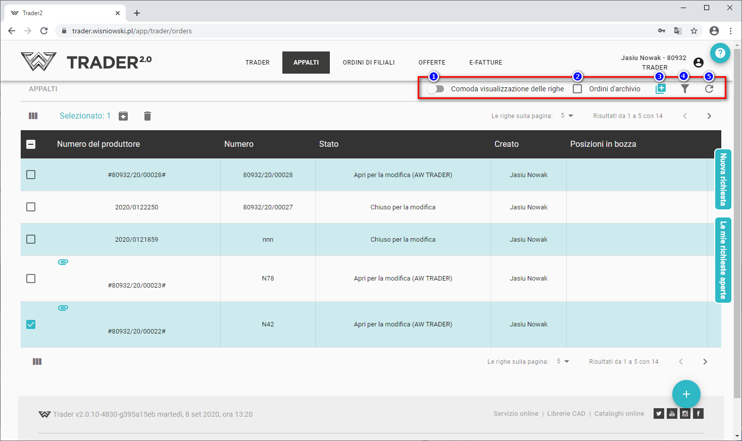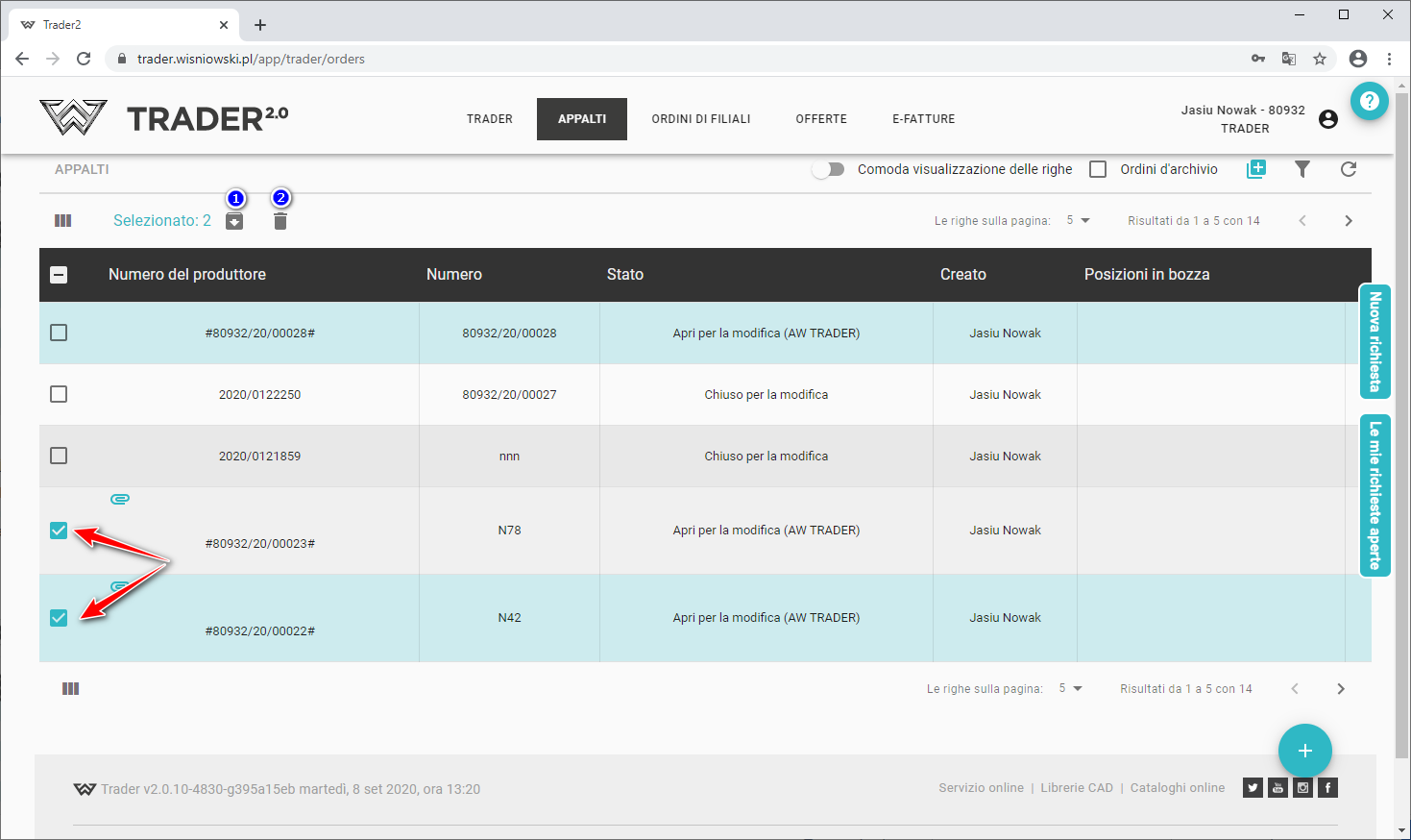È inoltre disponibile l'opzione di selezionare/deselezionare una o più posizioni; in questo caso, diventano attive le opzioni 'Archivia' (1) e 'Elimina' (2) (attenzione! Il checkbox principale non seleziona tutti, ma seleziona un massimo di 200 posizioni)