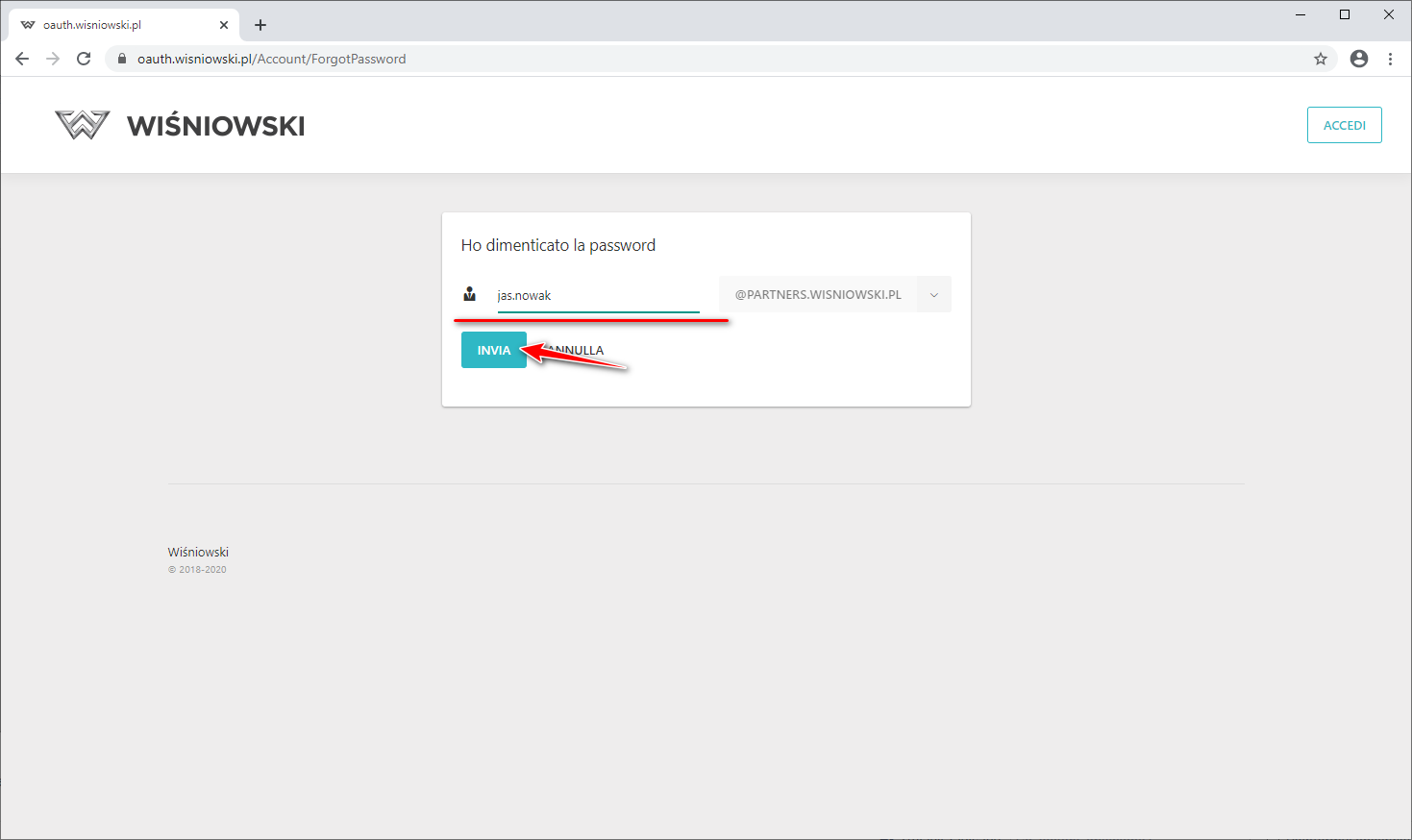 All'indirizzo e-mail fornito durante la registrazione dell'utente verrà inviato un link che consente di impostare una nuova password.