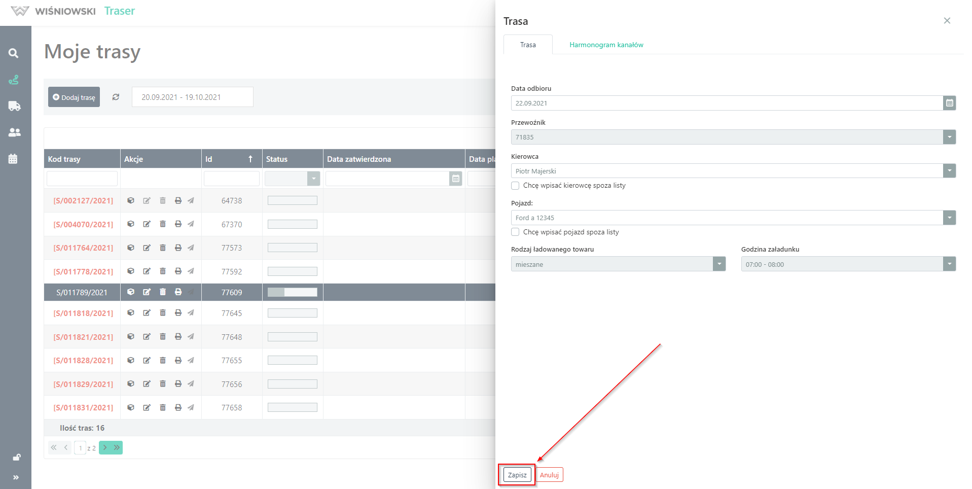 2. Na bocznym panelu wykonaj edycję Trasy i kliknij przycisk "ZAPISZ" (Rys. 2.).