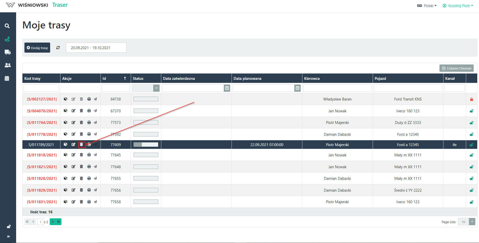 1. Aby usunąć Trasę, kliknij przycisk z ikonką kosza, przy odpowiedniej Trasie (Rys. 3), a następnie potwierdź usunięcie klikając przycisk "USUŃ".