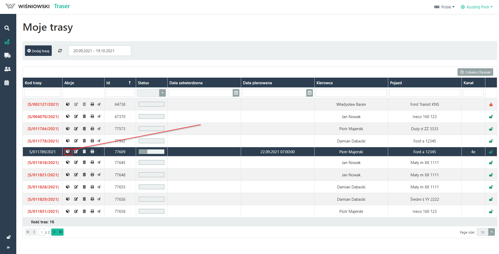 1 - Wybierz w bocznym Menu: Pokaż trasy. Powinna wyświetlić się lista Tras. Kliknij przycisk z ikonką informacji, przy odpowiedniej Trasie (Rys. 1.).
