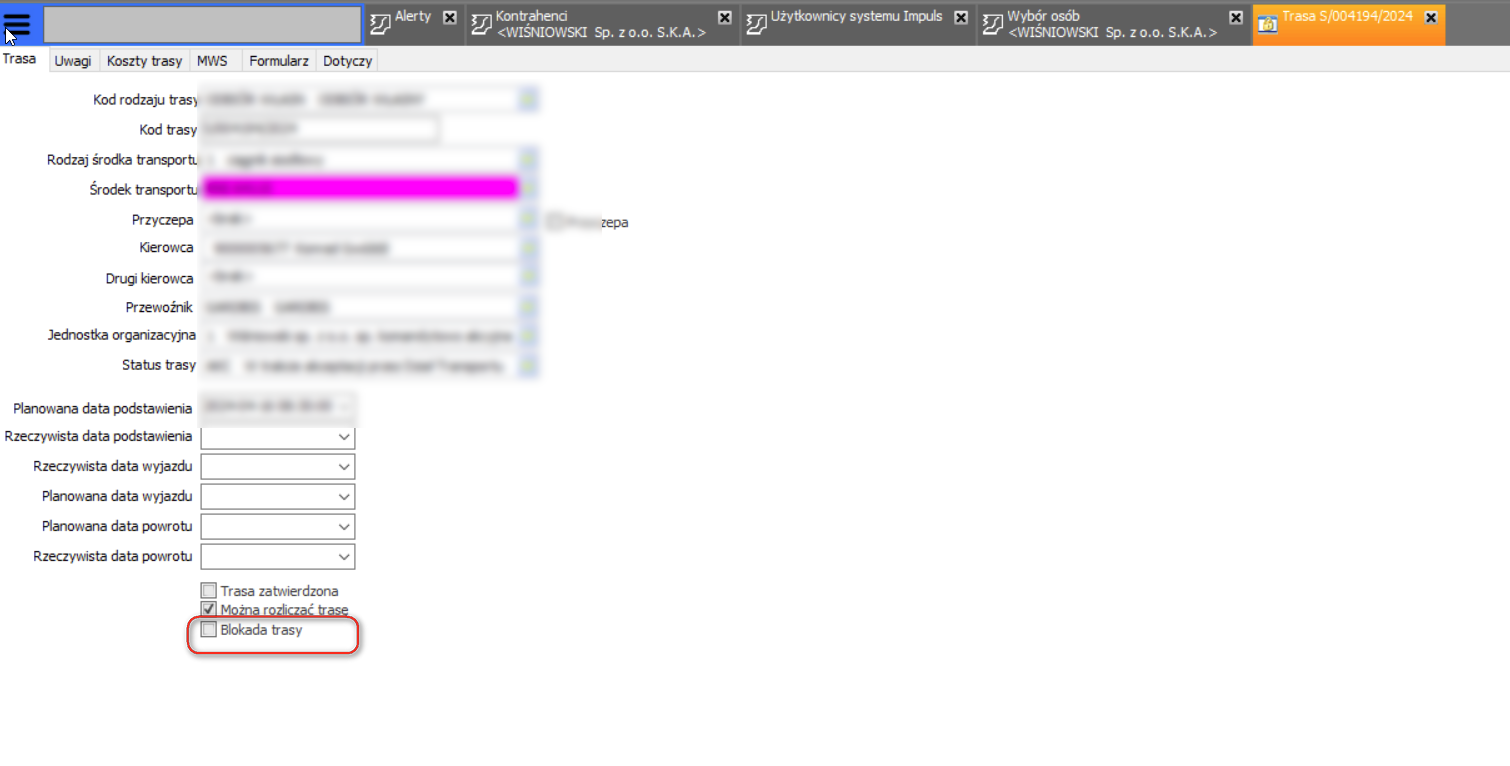 Ustawiona blokada w Impulsie (wchodzimy w szczegóły trasy w impulsie):