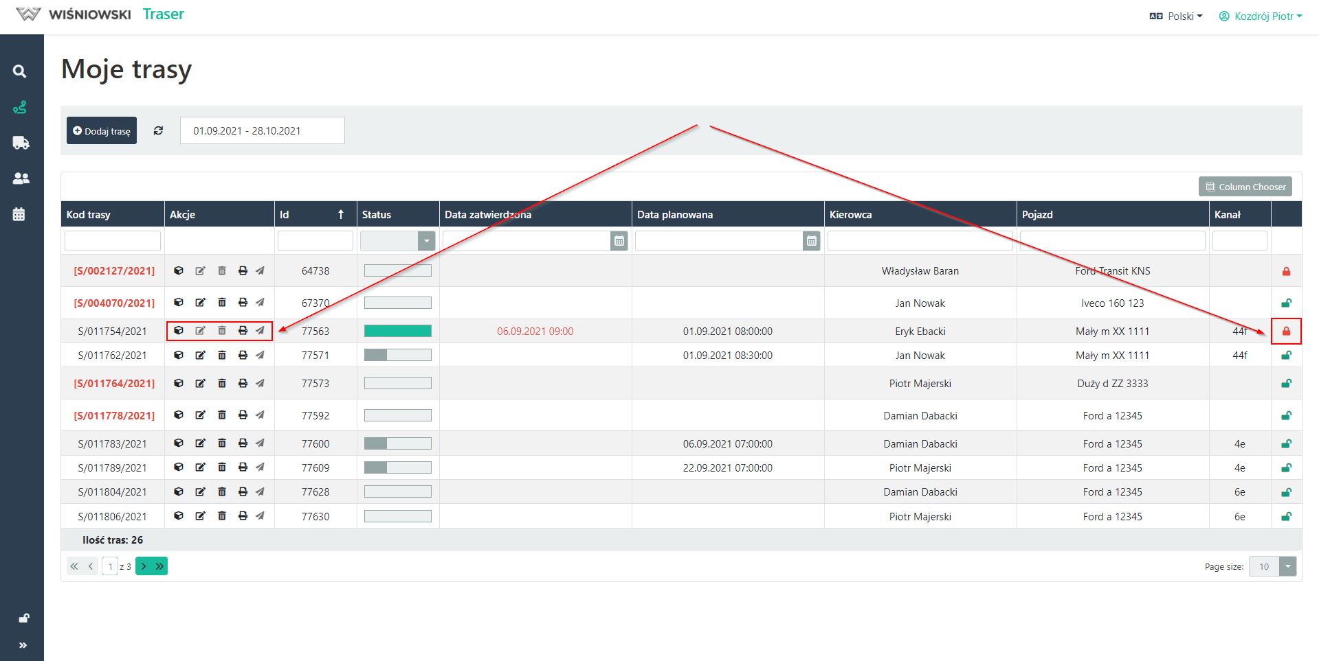 Trasy, które są zablokowane, nie mogą być edytowane/usuwane i oznaczane są symbolem zamkniętej kłódki na czerwonym polu (Rys.2).