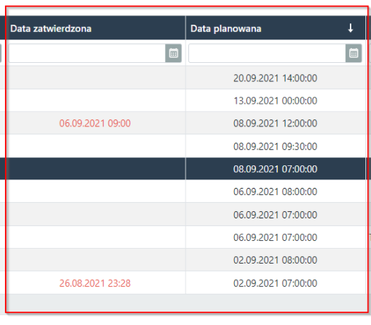 - jeżeli data zatwierdzona różni się od daty proponowanej, wtedy data zatwierdzona wyświetla się na czerwono, aby zwrócić uwagę użytkownika.