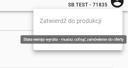 Jeżeli w momencie próby zatwierdzenia zamówienia do produkcji pole jest nieaktywne, pojawi się na tej akcji komunikat informujący że na zamówieniu znajduje się pozycja ze starą wersją wyrobu i konieczne jest cofnięcie zamówienia do oferty. Następnie należy wykonać kroki analogiczne jak w przypadku aktualizacji wersji wyrobu na ofercie.