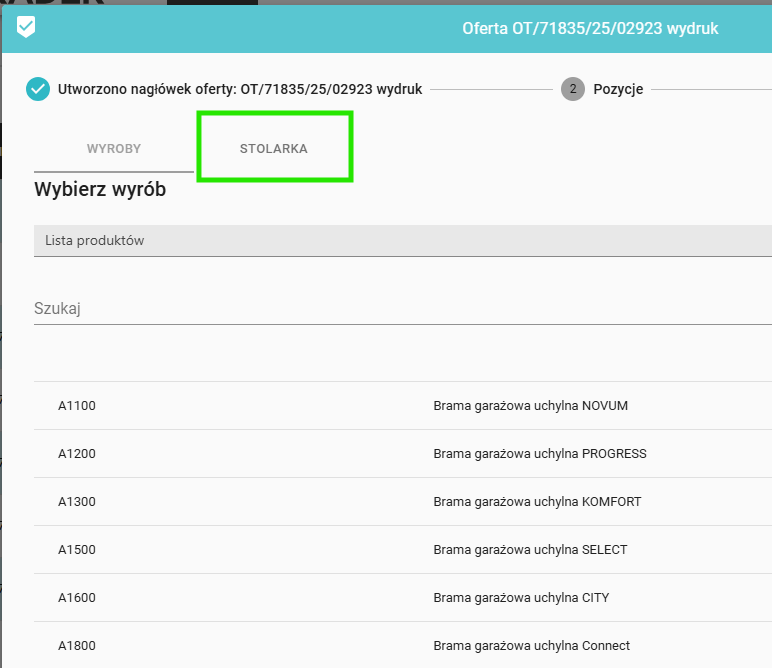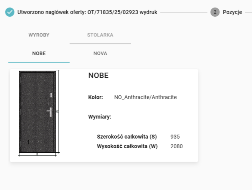 Podczas przygotowania oferty na etapie wyboru produktu przechodzimy do zakładki STOLARKA. Proszę zwrócić szczególną uwagę, że w przypadku Wyceny drzwi NOVA i NOBE musimy zawsze rozpoczynać proces ofertowania od tworzenia „oferty”. Z przyczyn technicznych nie można rozpocząć wyceny od zamówienia.