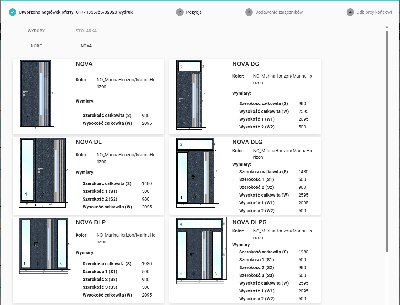 Po wybraniu zakładki stolarka w wierszu poniżej pojawia się podział na drzwi NOBE oraz drzwi NOVA.