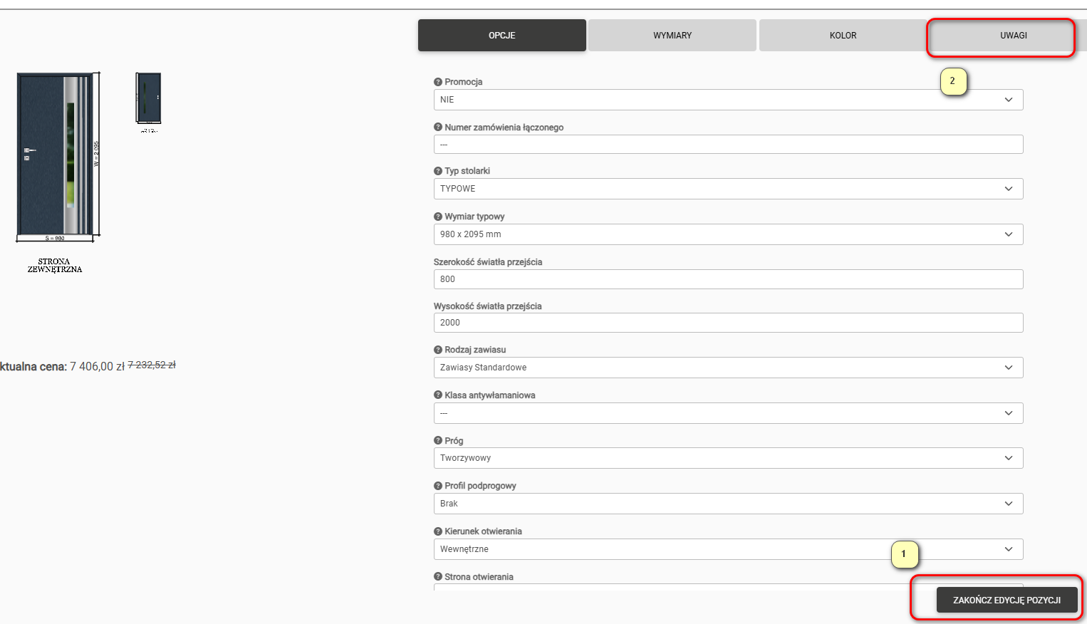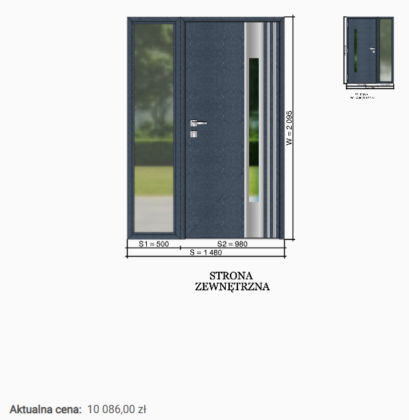 Po lewej stronie pojawia się wizualizacja drzwi oraz cena wyrobu. Proszę zwrócić uwagę, że cena aktualizuje się podczas każdej zmiany opcji (właściwości). Ta funkcjonalność pozwala w prosty sposób na sprawdzenie różnicy cenowej podczas zmiany poszczególnych elementów wyposażenia.
