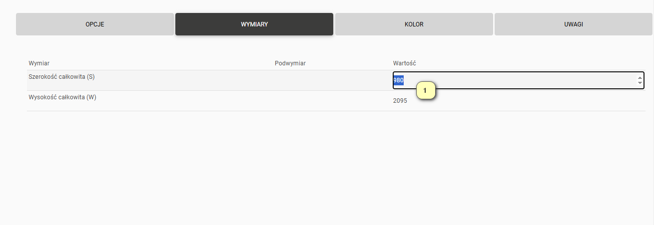 W zakładce wymiary należy zmodyfikować wymiar drzwi w przypadku wymiarów nietypowych oraz wymiary doświetli. Typowy wymiar drzwi konfigurowany jest na poziomie opcji