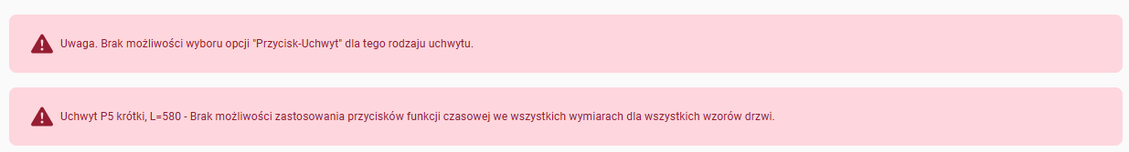 W przypadku wybrania opcji, która nie jest możliwa do zastosowania pojawią się czerwone błędy- restrykcje. W treści błędu zawarta jest informacja czego dotyczy problem.