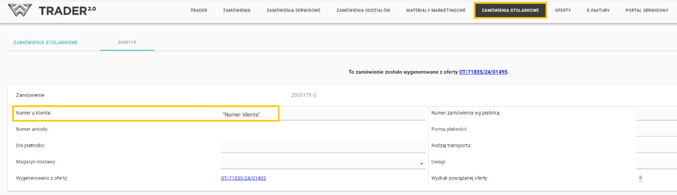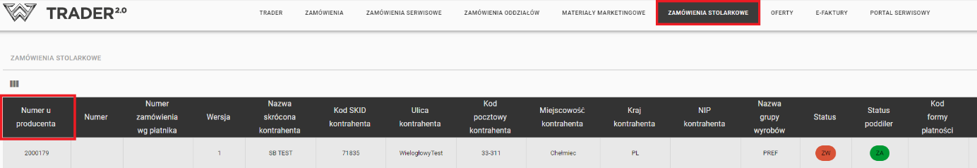 - Kolorem czerwonym – numer zamówienia Trader2.0 odpowiadające numerowi z zakładki „Zamówienia Stolarkowe” w kolumnie „Numer u producenta”.